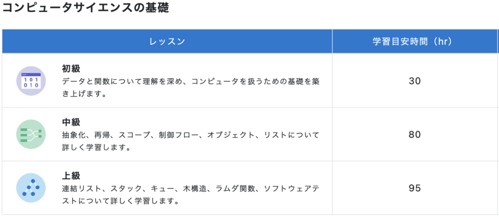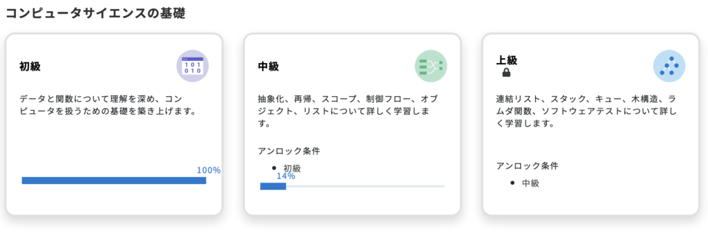 コンピュータサイエンスのコースは以下のように初級、中級、上級とレベル分けされています。