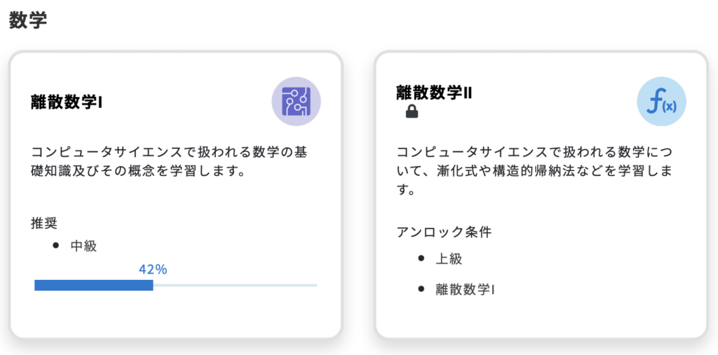 コンピュータサイエンス初級は無料と思えない内容ですので、これだけ学習するために登録しても損はないでしょう。