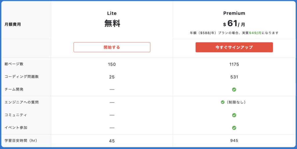 有料コンテンツはさらに充実しており、PHPやJavascript、Pythonといったプログラミングに関するコンテンツの他に、データ構造やアルゴリズムなど中級者・上級者向けのコンテンツ全てにアクセスできるようになります。